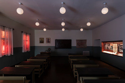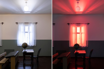 В светодинамической инсталляции светодизайнеры установили изготовленные под проект светильник-шары с запрограммированным хаотичным миганием. Для имитации световых лучей от прожекторов для обнаружения самолетов за окнами разместили мощные концертные приборы. Световая сценография вместе с звуковым сопровождением показывает период перехода от мирной школьной жизни к военному времени.