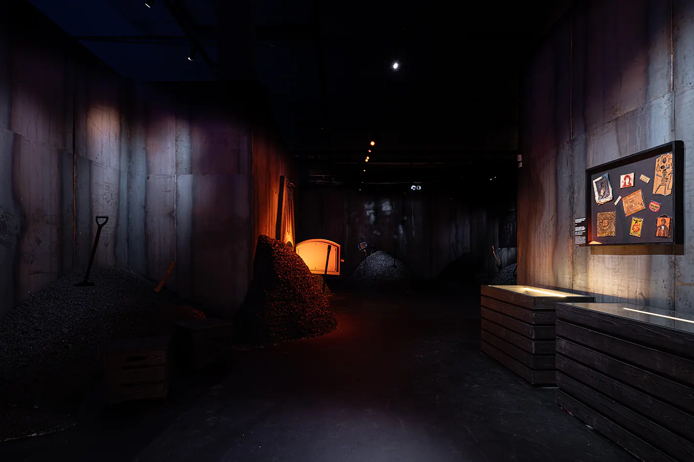 Чтобы сохранить визуальную яркость желто-черной спирали, решили высветить все плоскости: пол, потолок и стены. Поскольку поверхности нужно было осветить максимально возможной площадью, но ни один из видов освещения на объектах выставки на стенах не должен был превышать 50 Лк (нормы уровня освещенности исторических экспонатов), решили отыграться на яркости пола и потолка.
