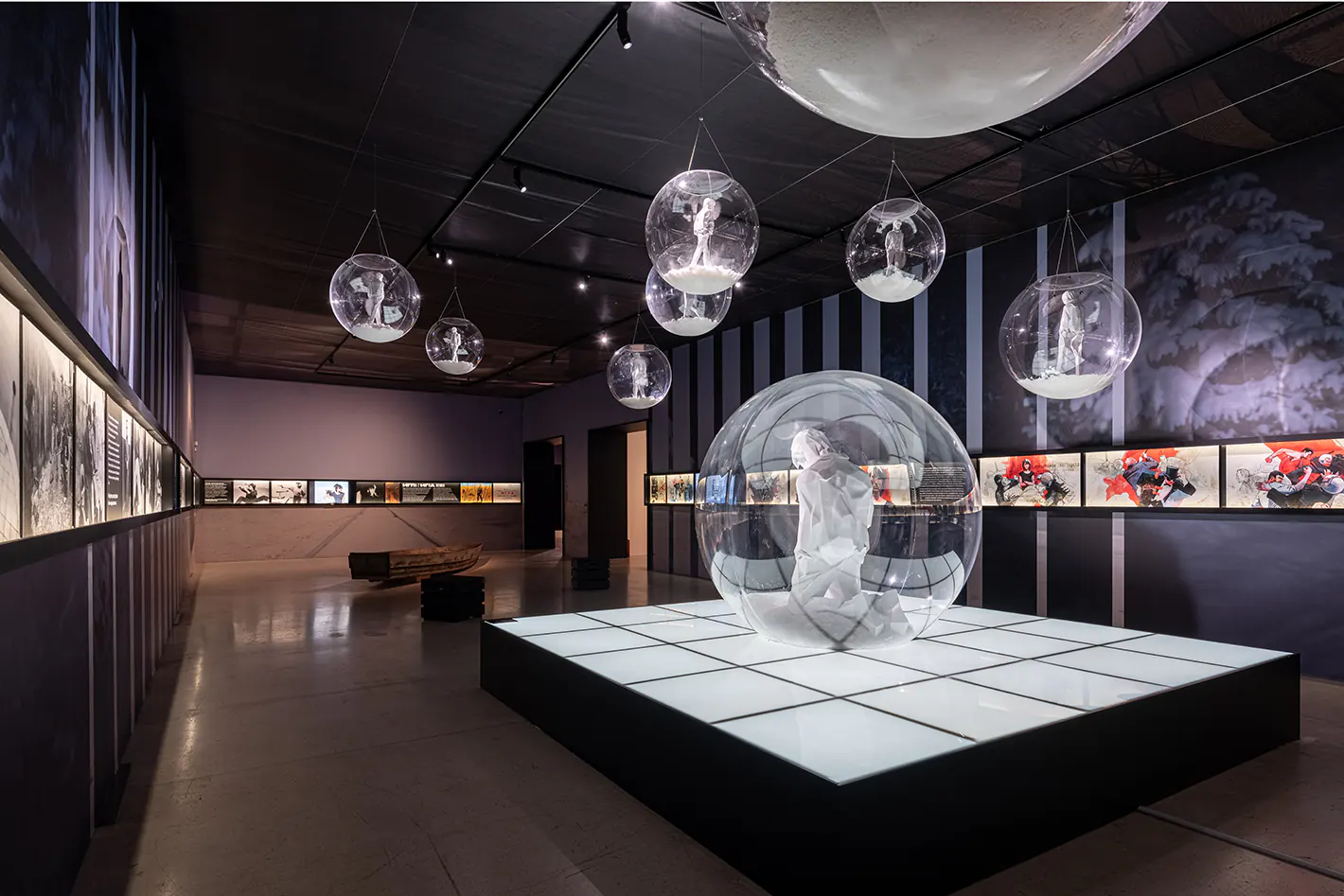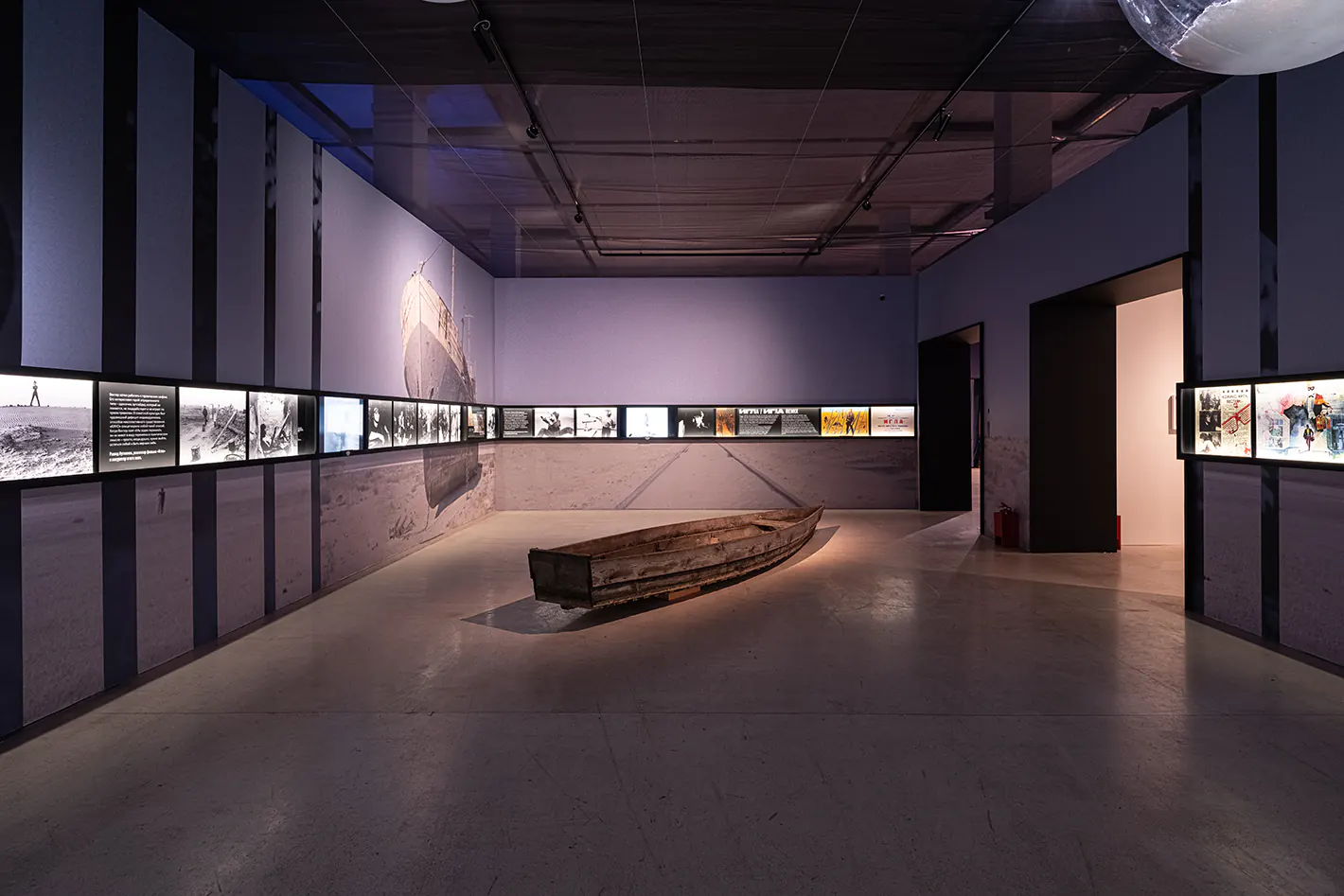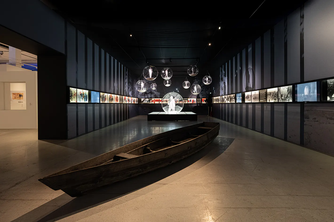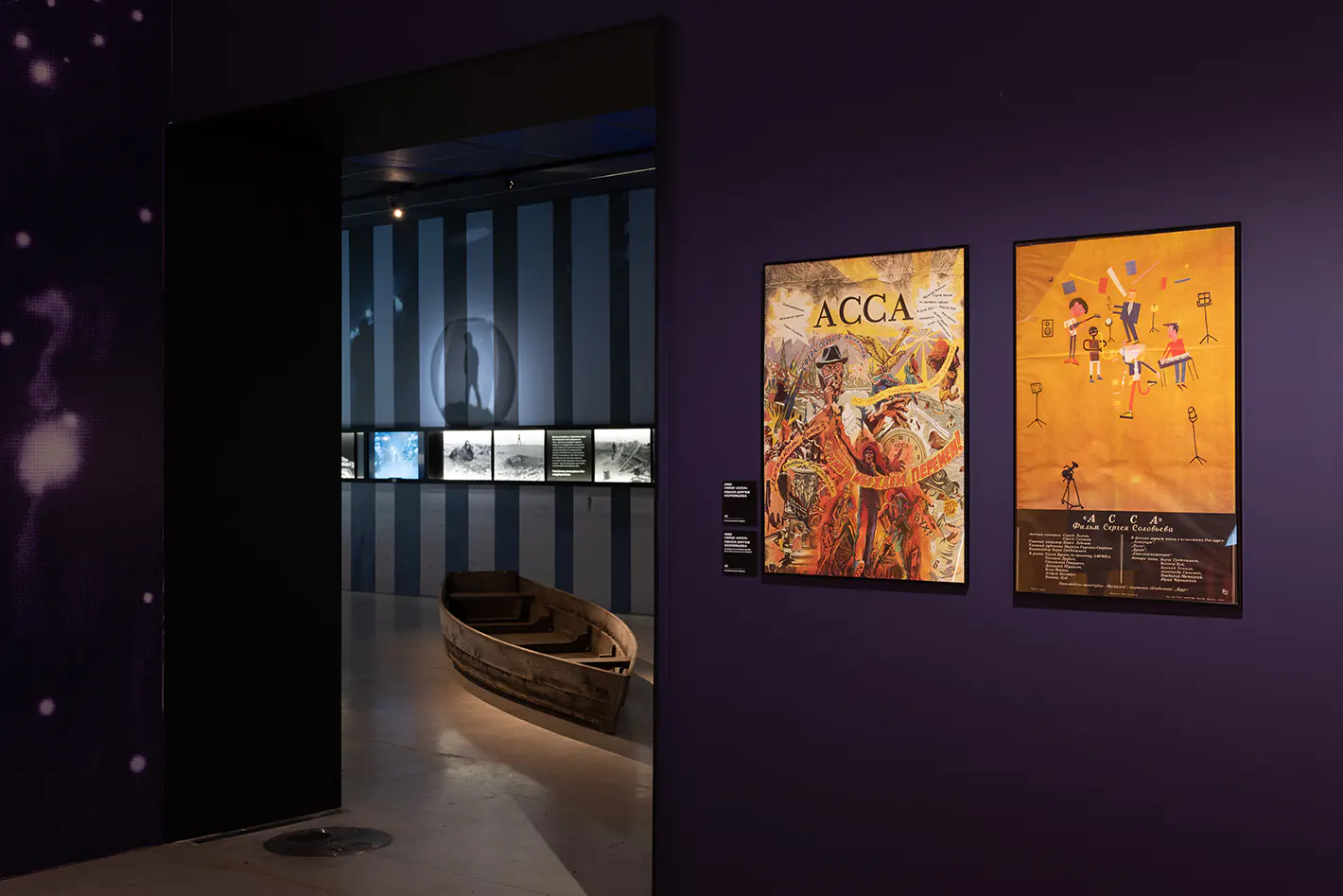 Следующий зал выставки рассказывает о фильмах «Игла» и «Игла Remix» Рашида Нугманова. Его сценография построена на встрече полюсов, которые были в кино: жаркая Аральская пустыня и зимний пейзаж.