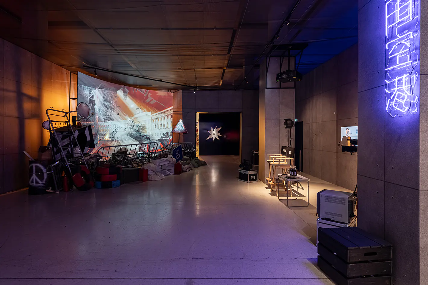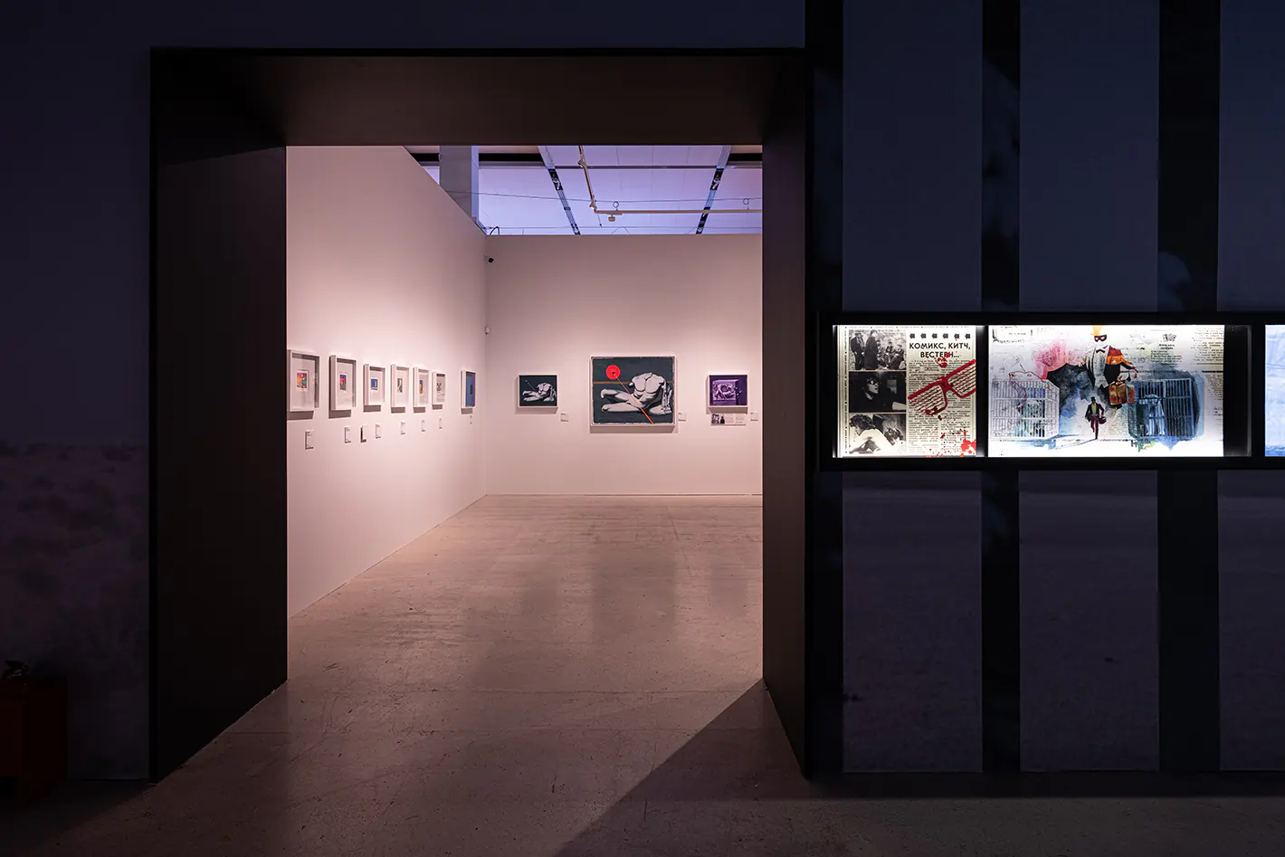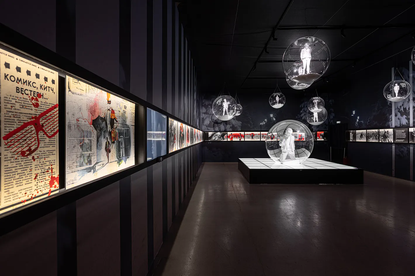 Первый зал выставки изначально был уютной гостиной со шкафами времён ГДР, которые плавно врастали в стены, превращая ее в комнату юного панкующего подростка.