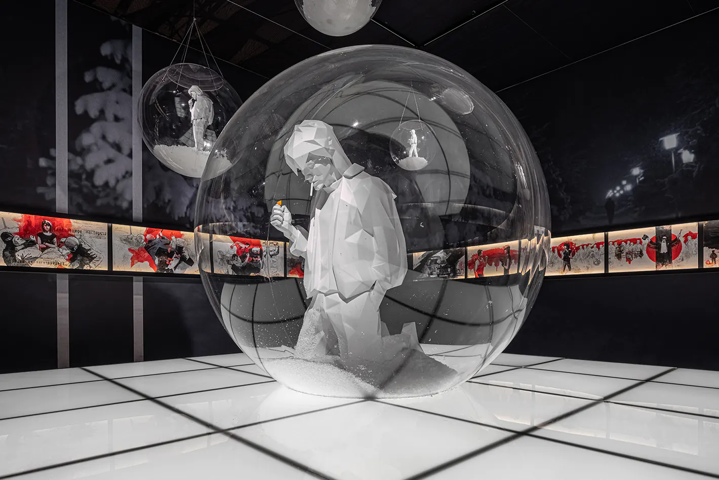 Центральной световой композицией стала инсталляция Snowball Memento Mori арт-группы Doping Pong: мы хотели создать снежный, абсолютно белый невесомый свет. Точечно высвеченные фигуры создают тени по всей «зимней» зоне зала, растворяясь в нём.