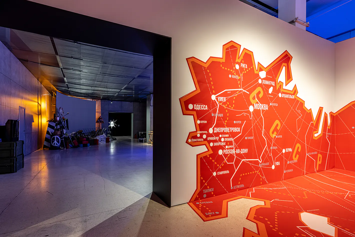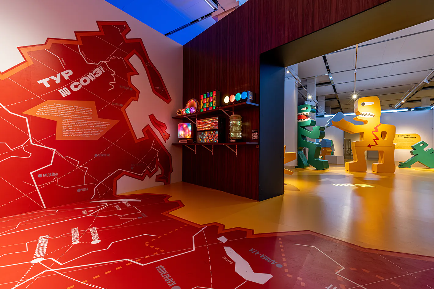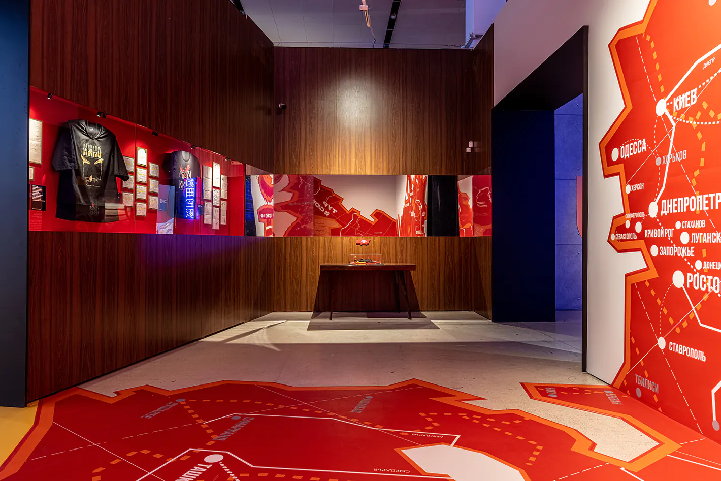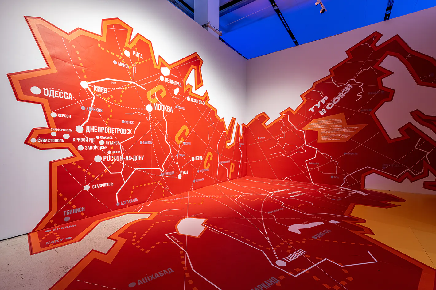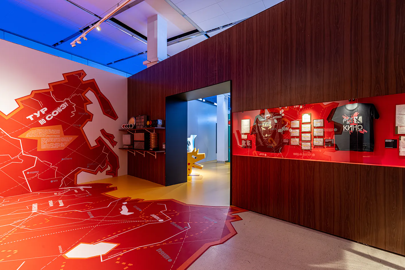 Архитектура этой экспозиции построена на контрастах. С одной стороны, за счет гигантской карты страны мы показываем масштаб творческой жизни Виктора Цоя. С другой — создаем образ тесных гримерных и казенных гостиниц, где останавливались музыканты.