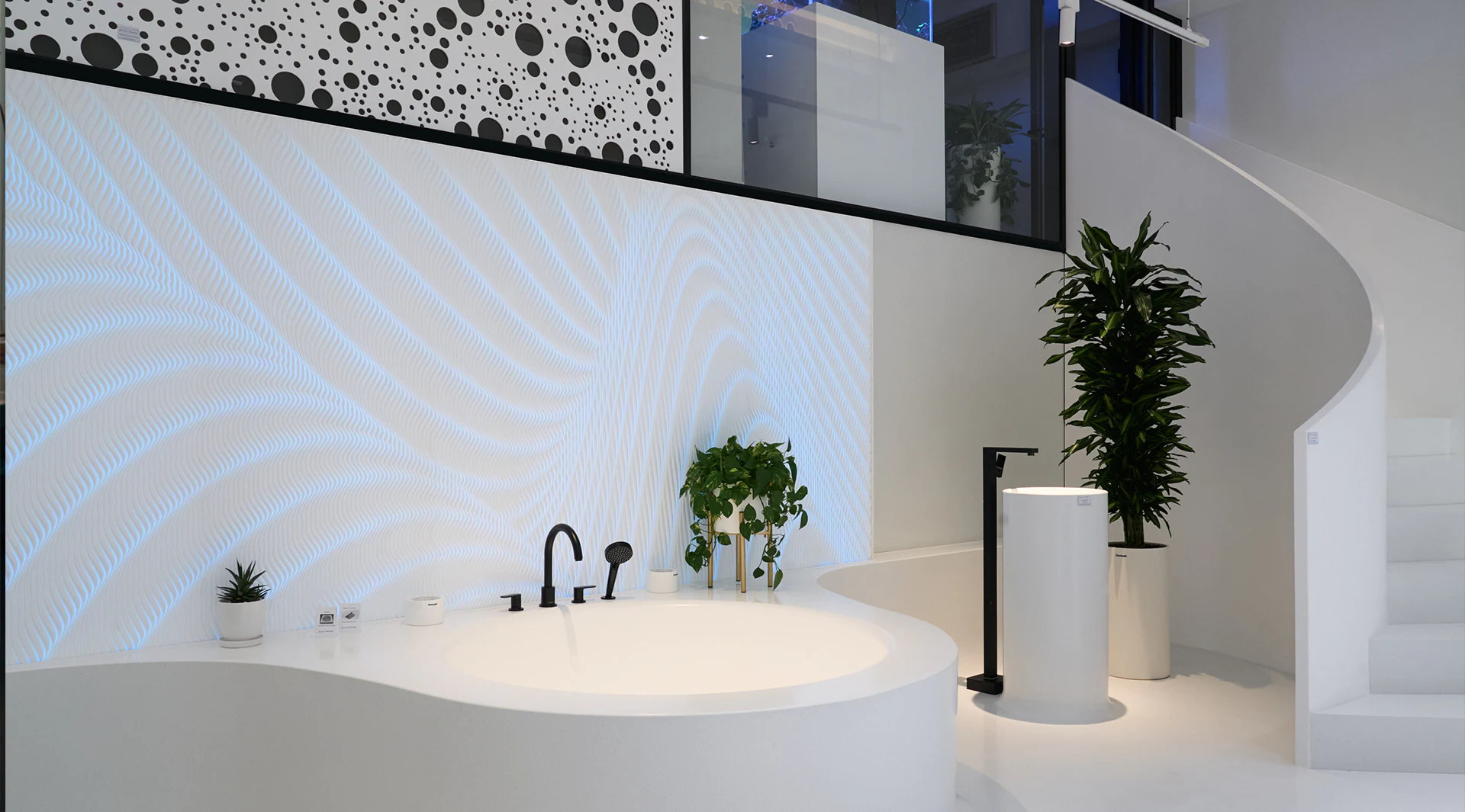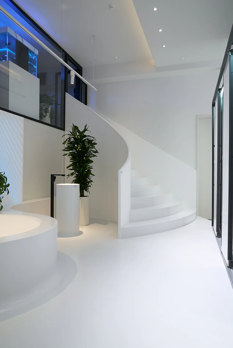 Место разговора — шоурум бренда искусственного камня K-stone с освещением aledo — пространство, которое презентует два типа объектов: