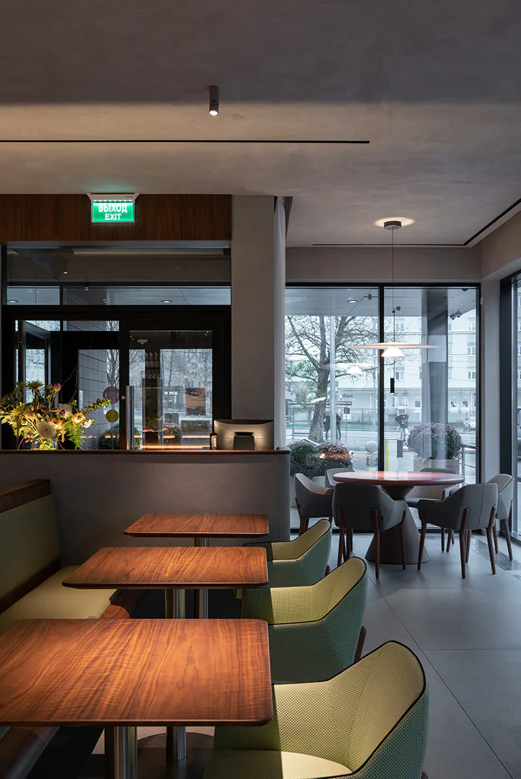 В течение дня основное освещение создается окнами по периметру, а с помощью кастомных светильников MINI FOCUS сформированы деликатные акценты на столах на фоне равномерного общего освещения, сохраняя непринужденную атмосферу заведения без излишней камерности как в дневное, так и в вечернее время.