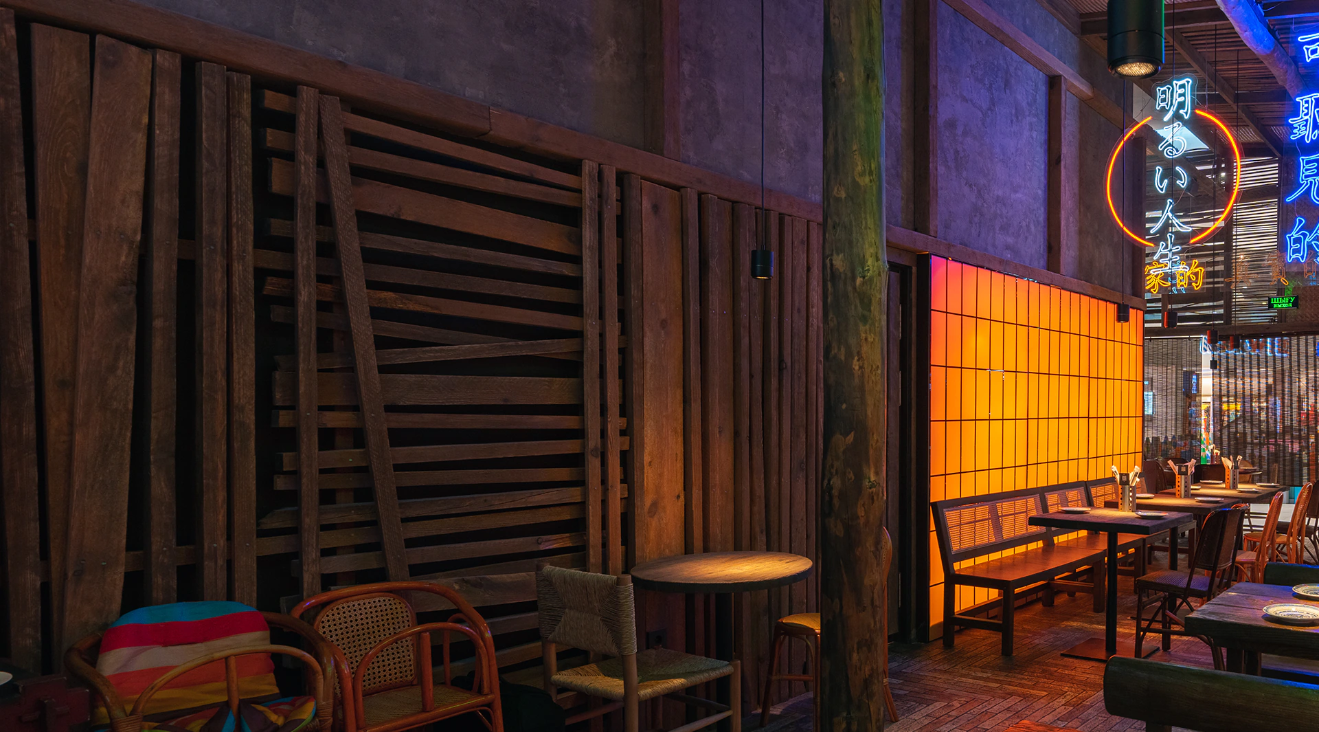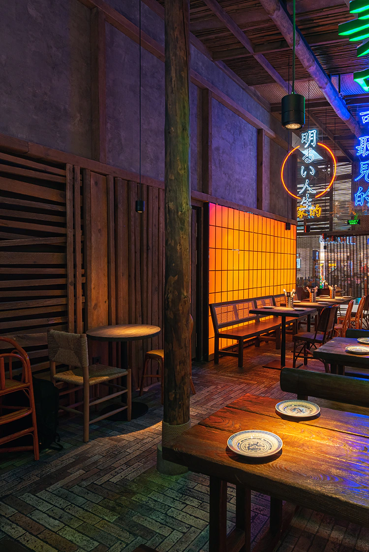 Футуристичный стиль повторяет атмосферу фильма «Бегущий по лезвию 2049»: нержавеющая сталь в отделке кухни, неоновые вывески, световые экраны, голограммы. Цветная RGB-подсветка расположена по фасаду и плинтусам помещения и подключена к системе управления, чтобы хостес мог менять различные режимы под настроение заведения или актуальные праздники.