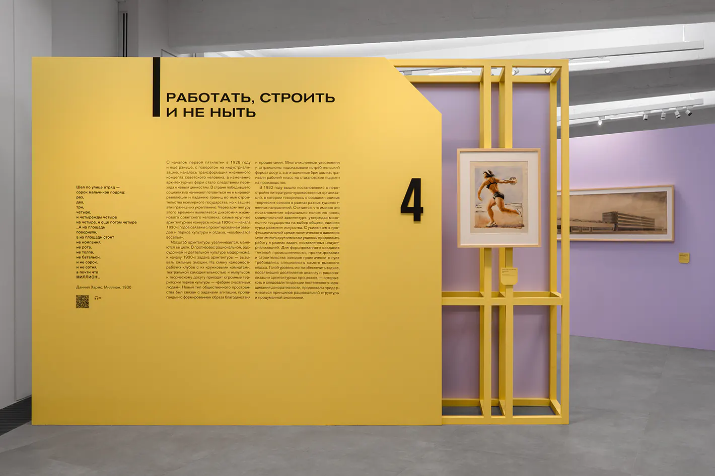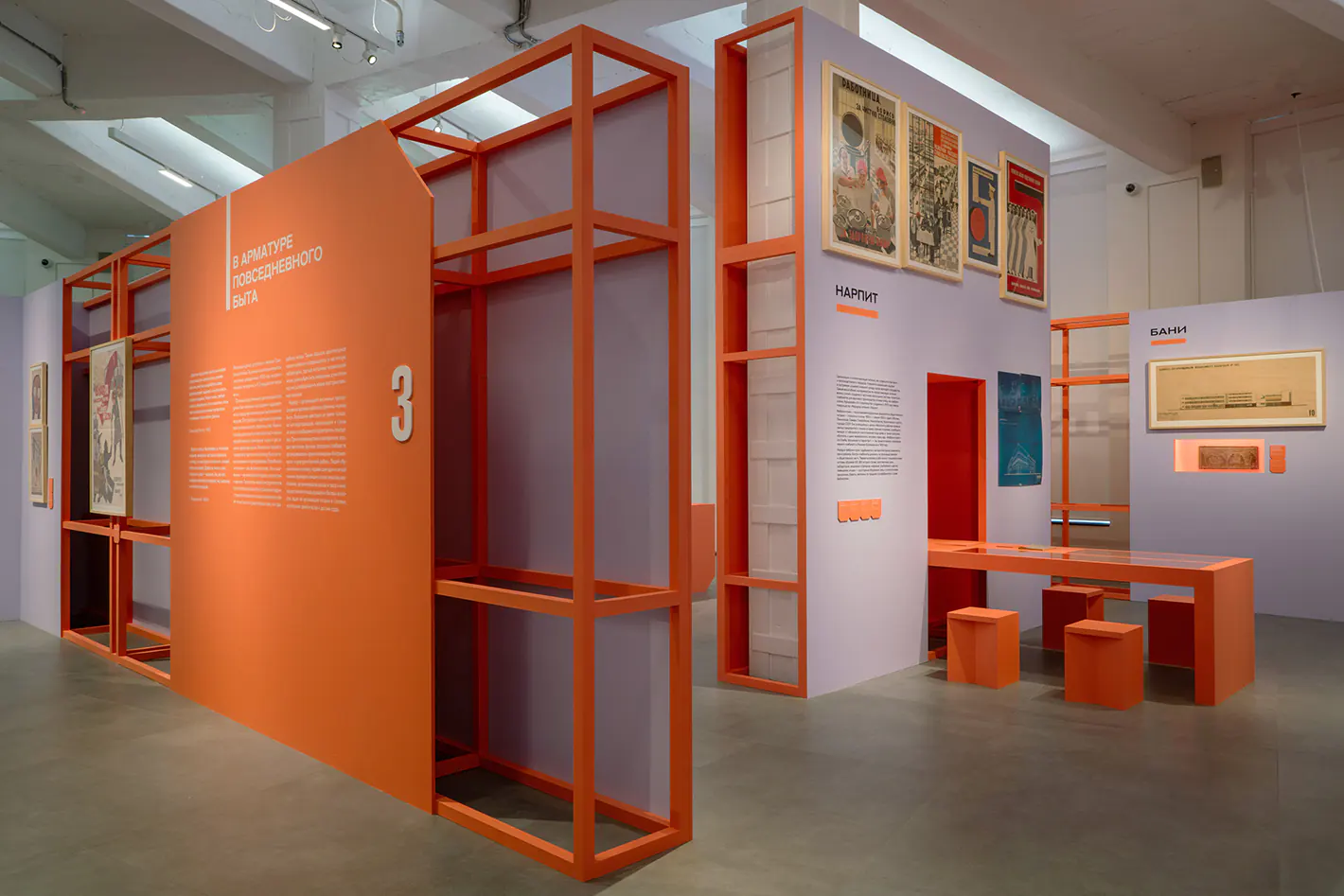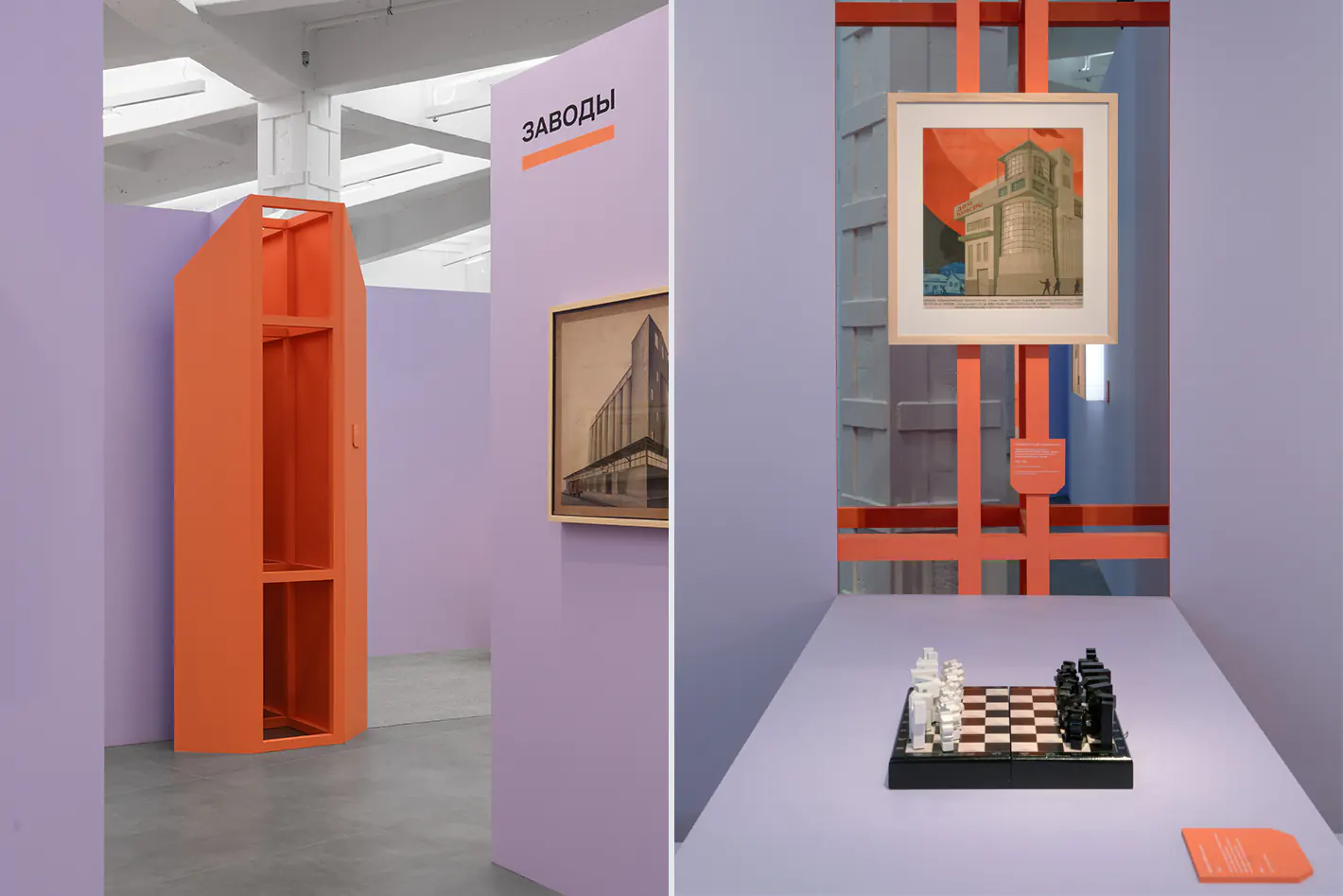В массовом сознании творениям советских конструктивистов присущи белый, черный и красный цвета. Авторы выставки продолжили эксперименты. Узнаваемый красный разбавили нежные фиолетовые и желтые оттенки.
