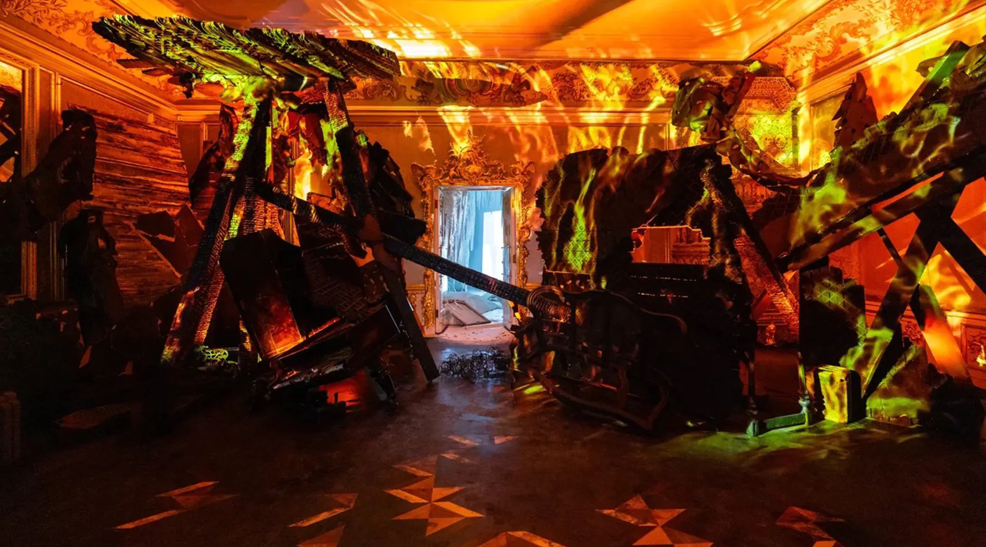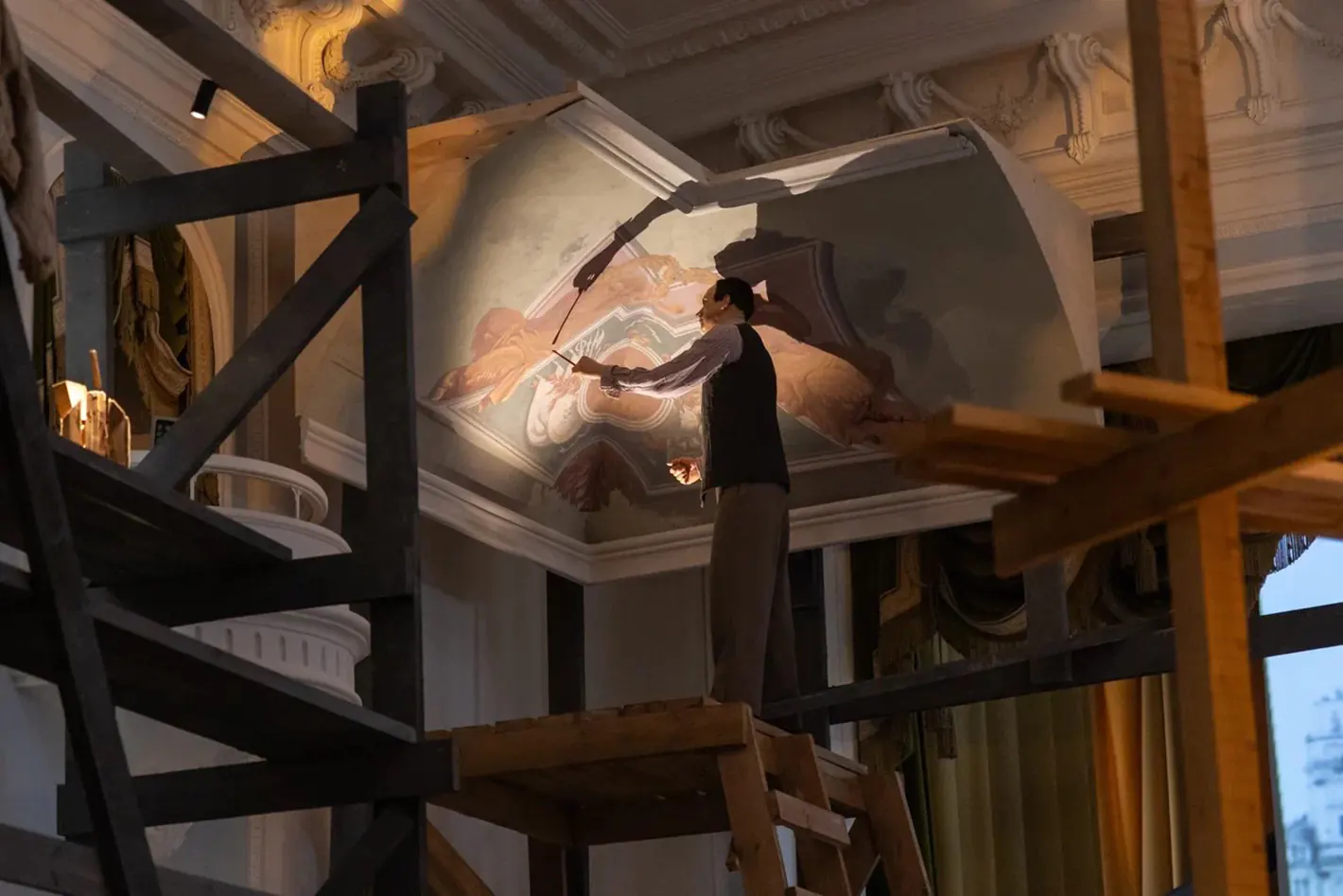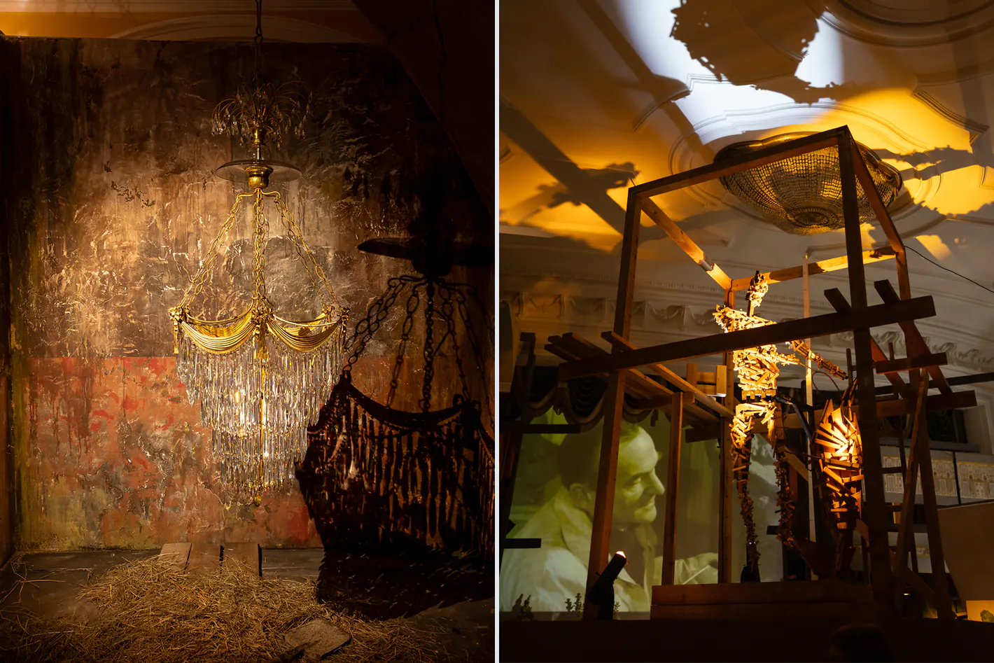 Инсталляция расположена в Большом дворце Петергофа. Важно было исключить любой риск возгорания объектов культурного наследия. Поэтому в качестве основных световых инструментов использовали приборы на трековой системе в 24 вольт. Низковольтное напряжение исключает возможность возгорания. Приборы удобно вручную снимать и перемещать по шинопроводу.