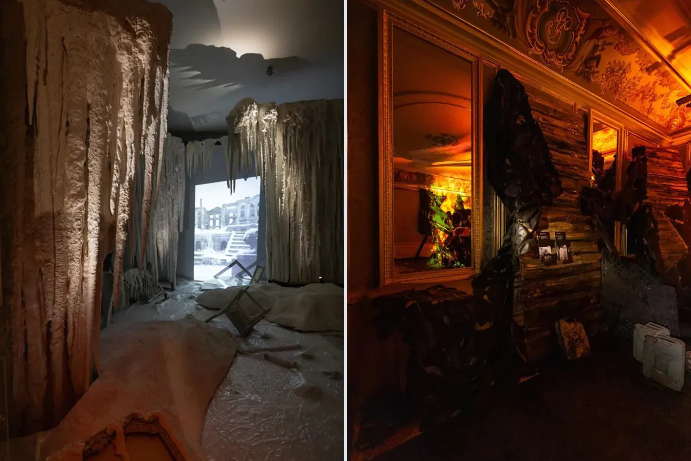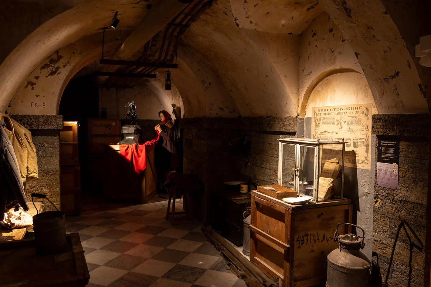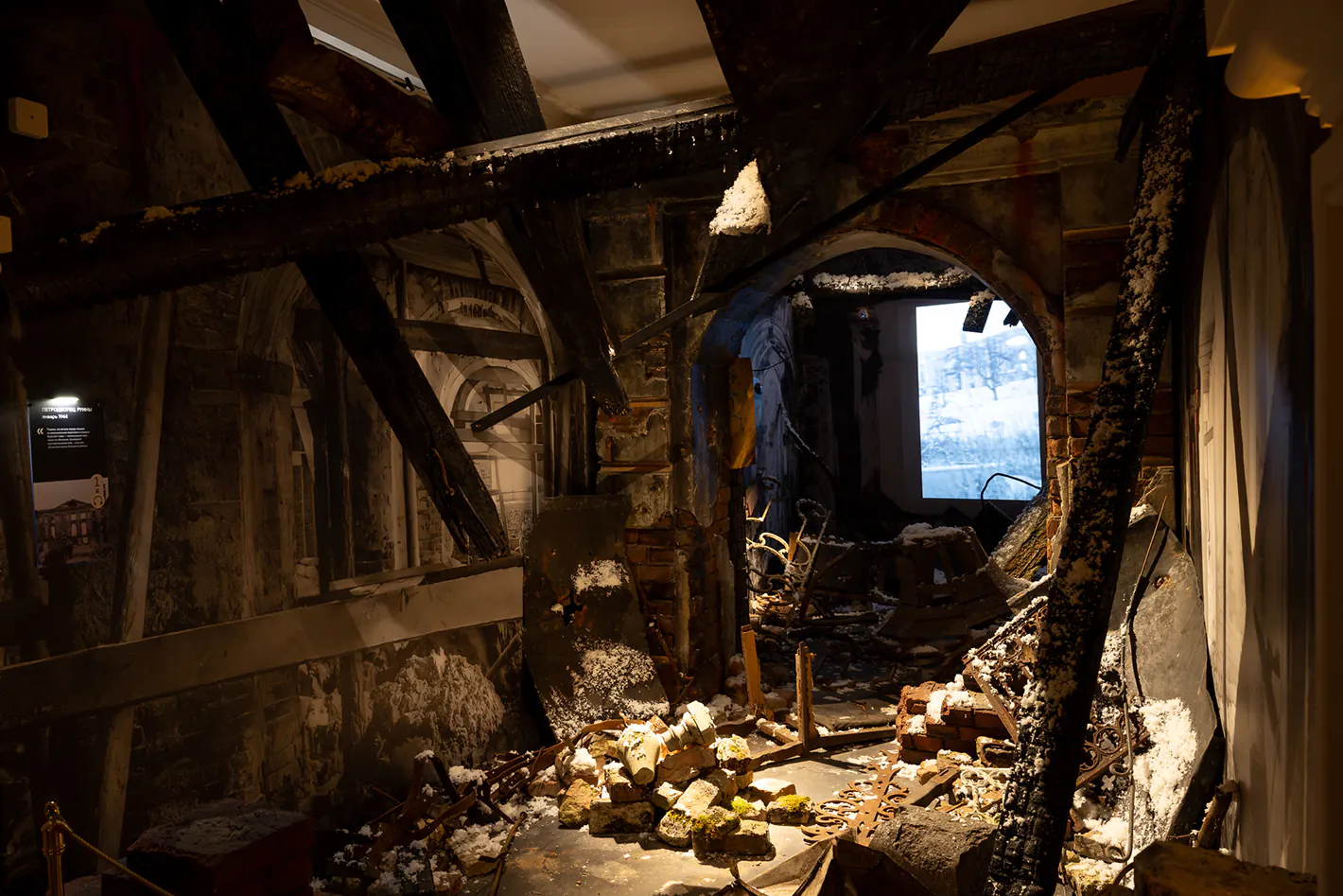 Экспозиция первого этаже посвящена эвакуации. Сотрудники музея прятали предметы искусства в подвалах, зарывали их в Нижнем парке, чтобы уберечь от обстрелов. Световое решение здесь усиливает чувство тревоги. Общий свет выключен. Приборы PUNTO ZOOM 50 II настроены так, чтобы создать высокие контрасты. Подлинную люстру за полуразобранной кирпичной стеной подсвечивают с нескольких сторон. Хрусталь искрится во тьме Большого дворца, как будто предвосхищая катастрофу будущего пожара.