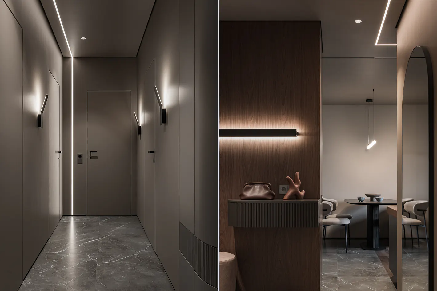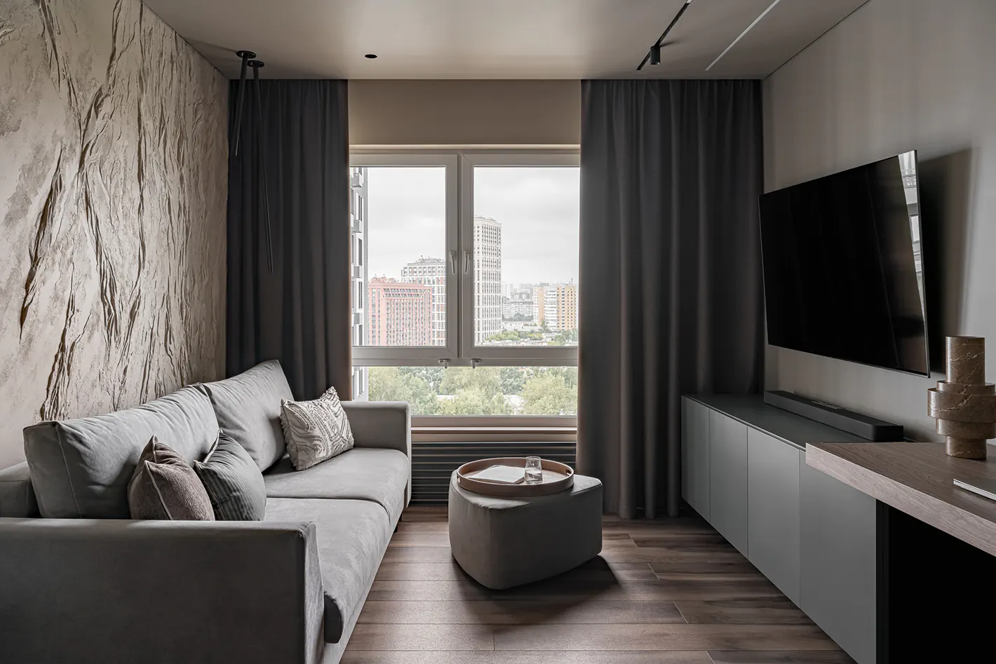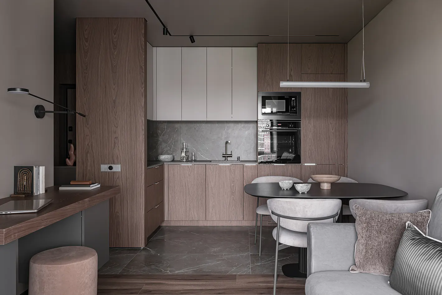Монохромный интерьер для молодой пары с котом и собакой. В квартире площадью 60 кв. м. созданы световые сценарии для работы, отдыха и рутинных ритуалов.