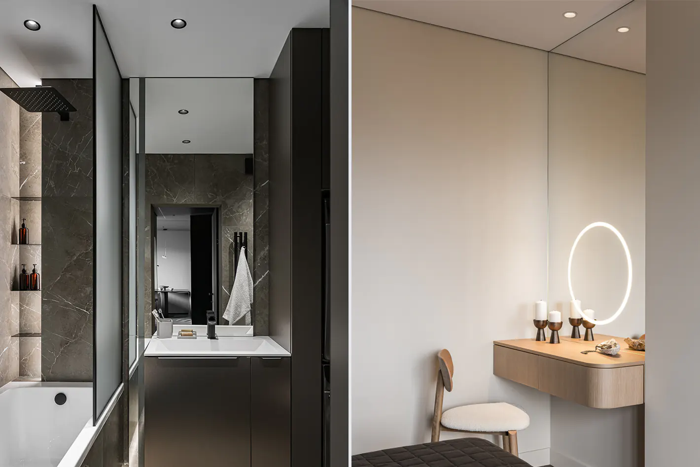В спальне для комфортного нанесения макияжа установлен MODUS 68 с углом свечения 24° — аккуратный акцент на столешницу туалетного столика. Дополнен зеркалом с фронтальным световым кольцом, которое смягчает тени.