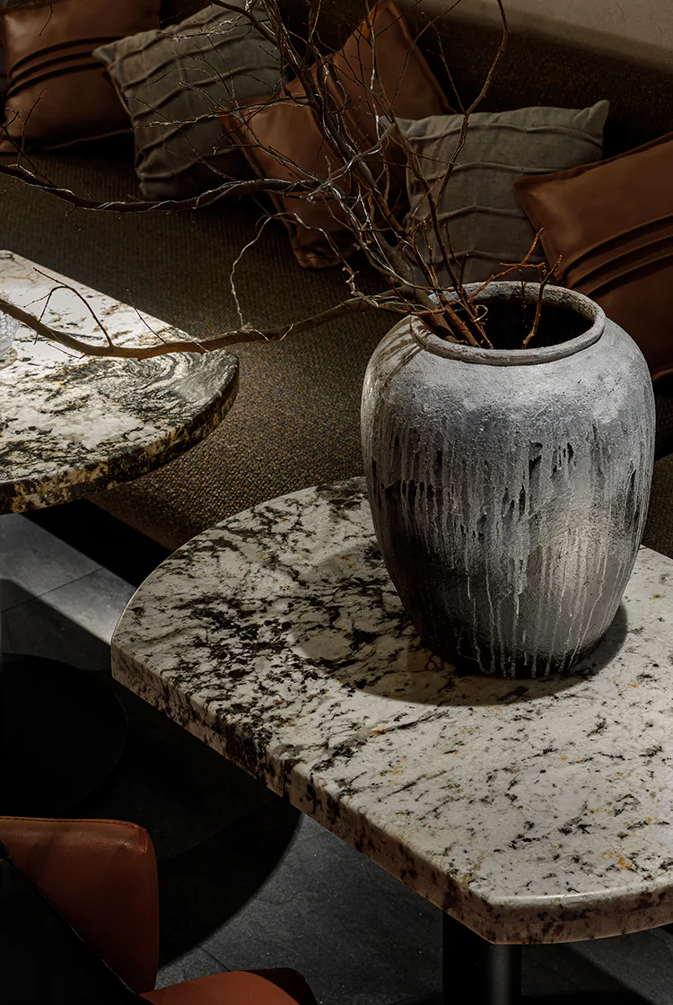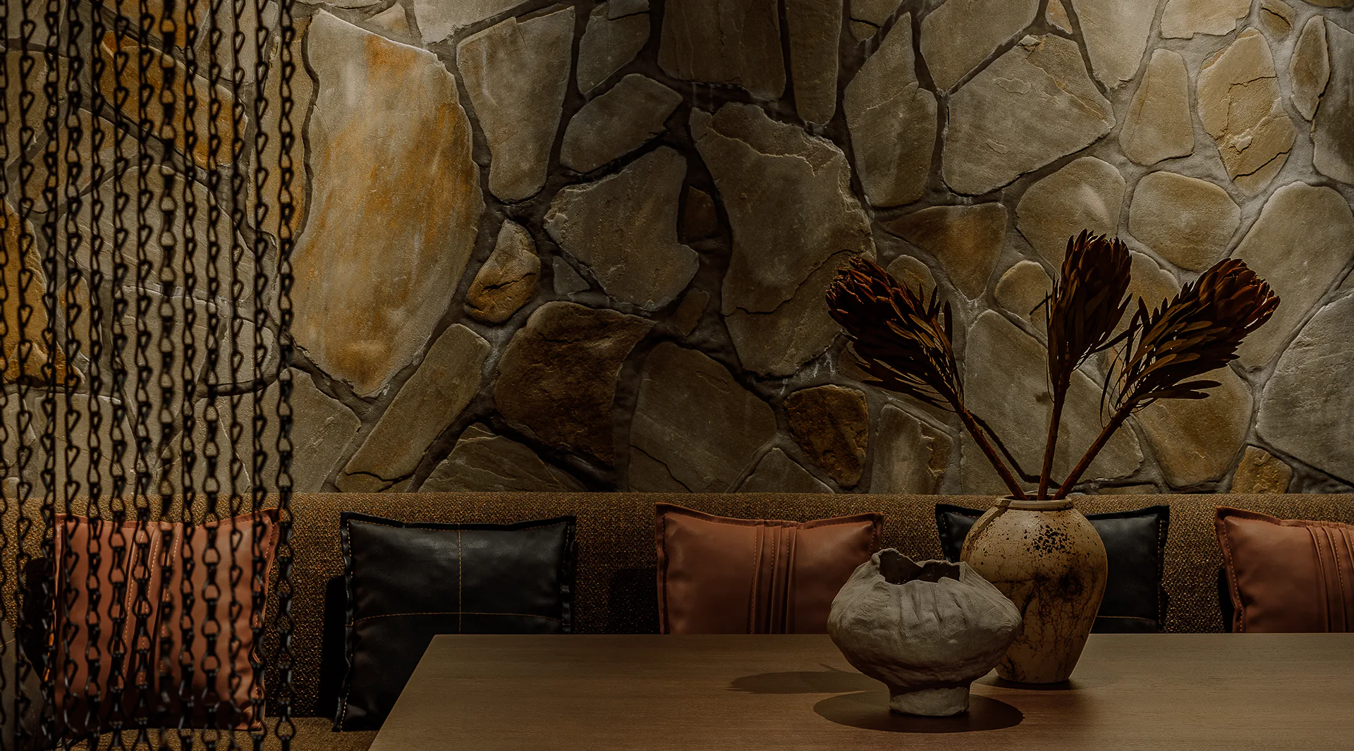 JACKY ZOOM 50C II — акценты на столешницах из натурального камня, фактурных стенах и элементах декора.