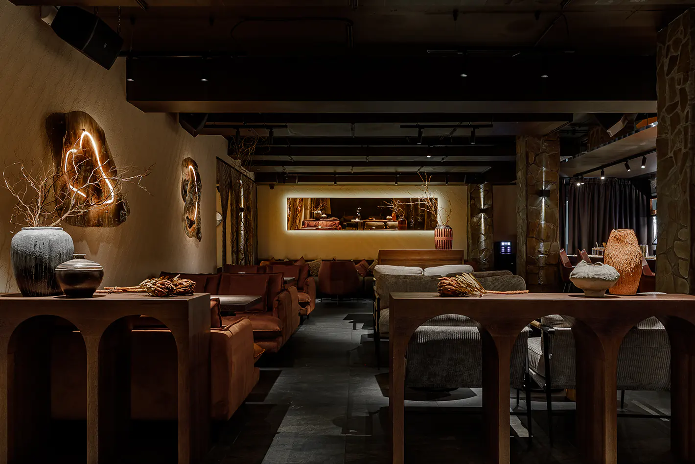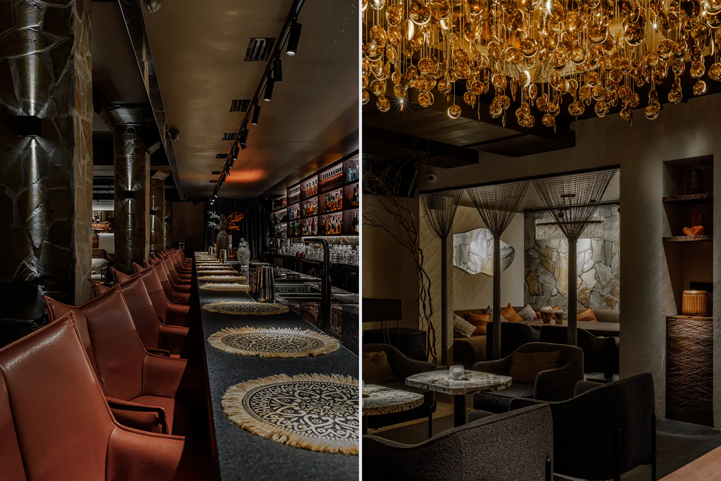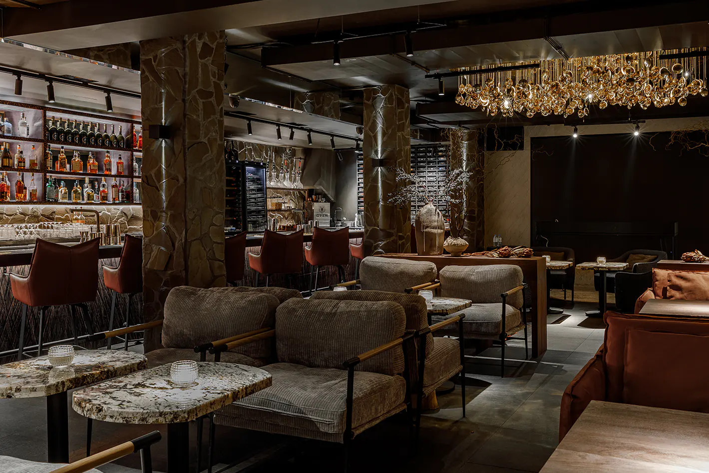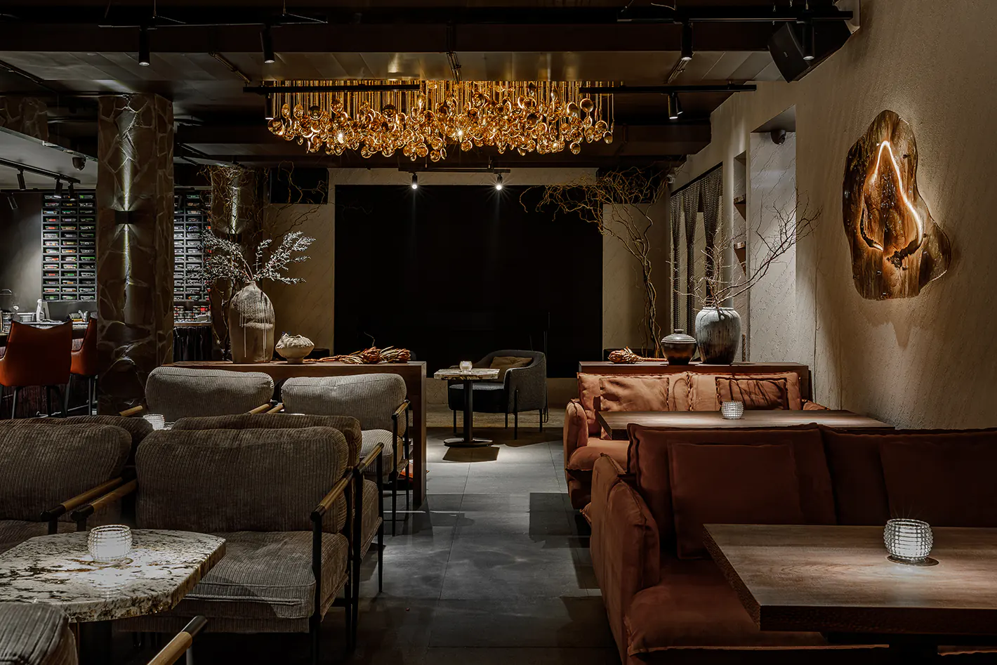 Задача света: визуально поднять потолки, создать интимную атмосферу ночного клуба и акцентировать материалы интерьера: натуральный камень, шероховатую натуральную штукатурку, дерево, кожу и замшу.