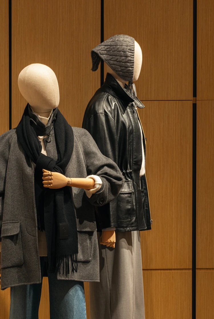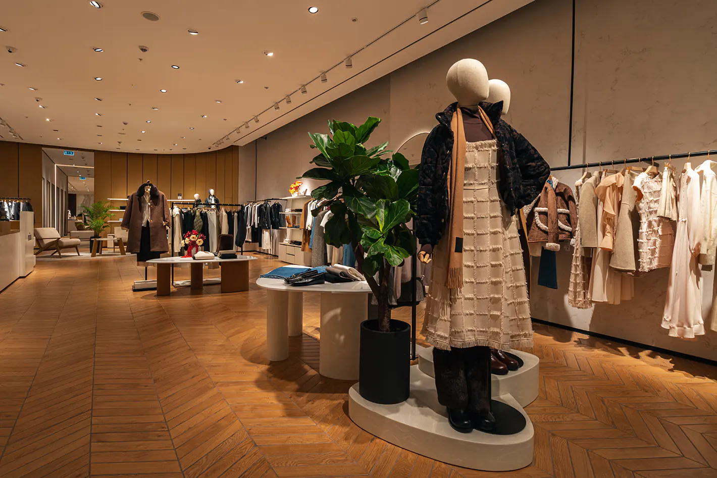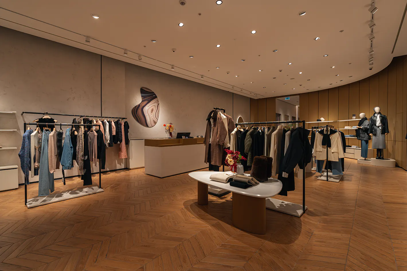 Задача света — осветить зону выкладки широкими световыми пятнами и создать эффект светового купола над одеждой. Для эффекта светового купола смешали разные углы света встраиваемых SONIC.