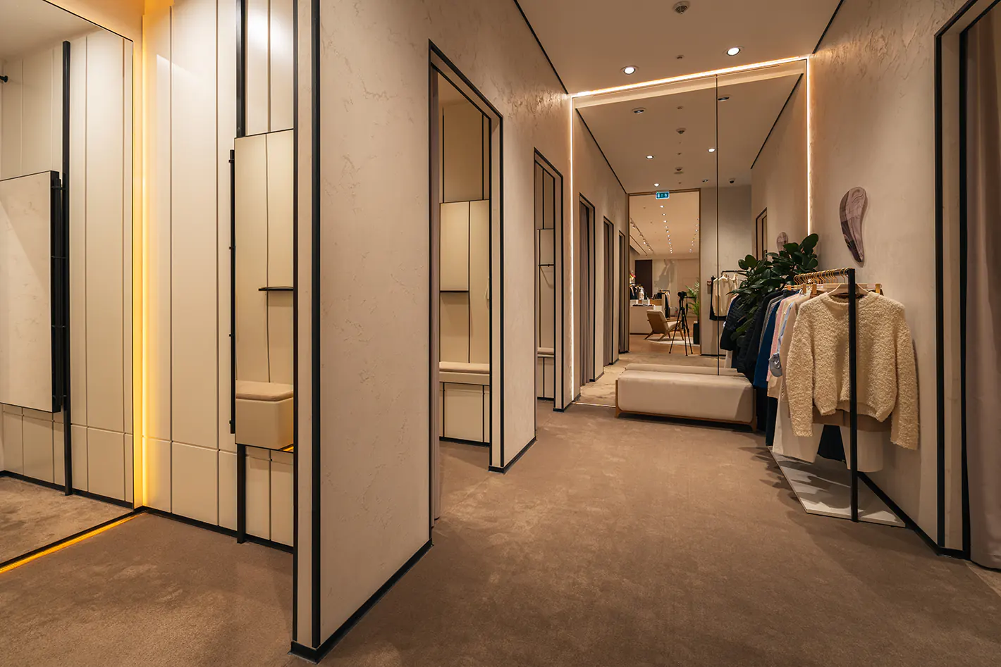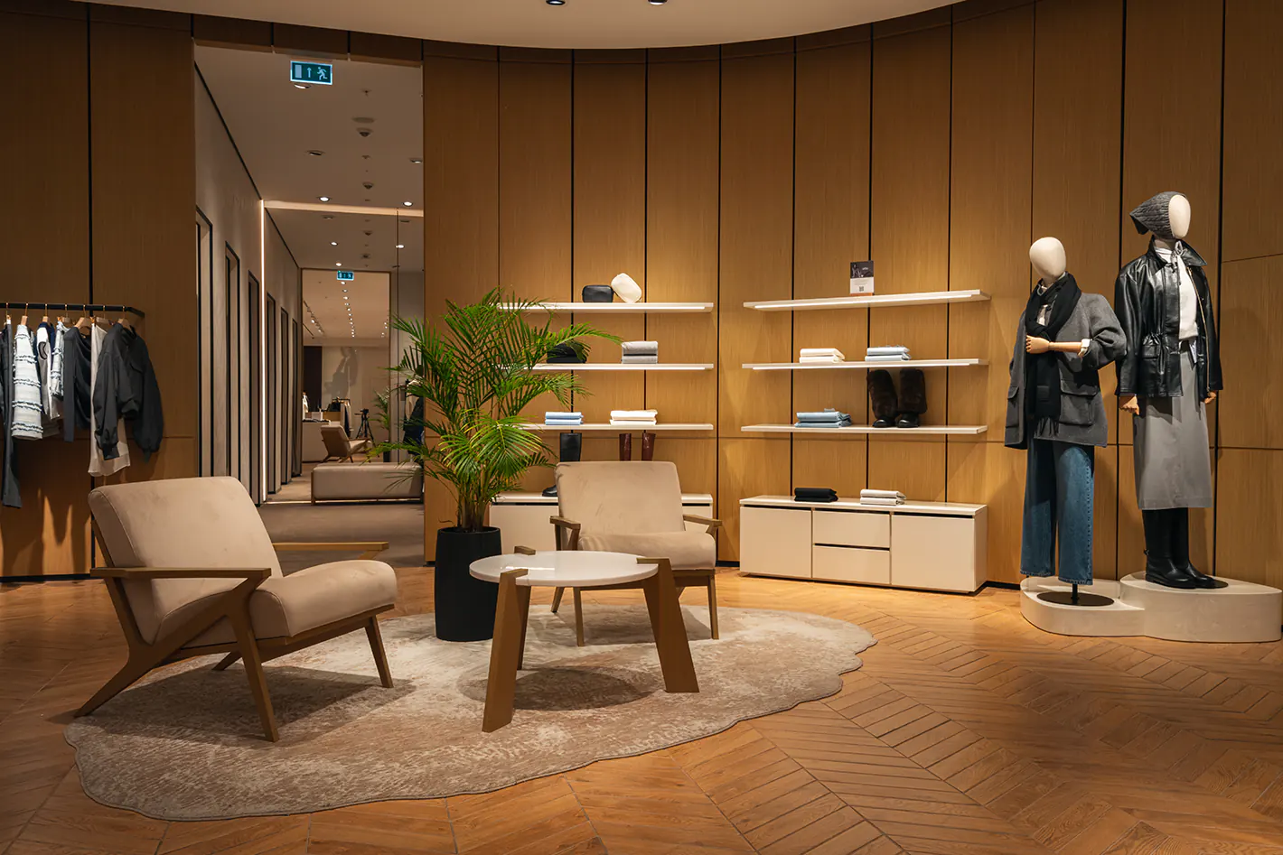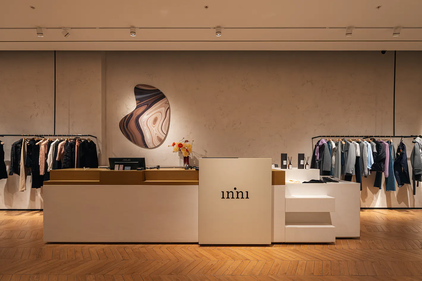 Дизайн интерьера магазина INNI в ТЦ «Авиапарк» отражает концепцию бренда «тихой роскоши» с минималистичным подходом и нейтральной цветовой гаммой.